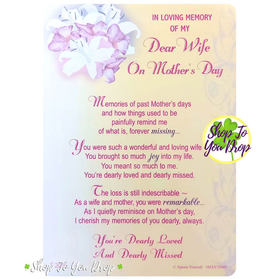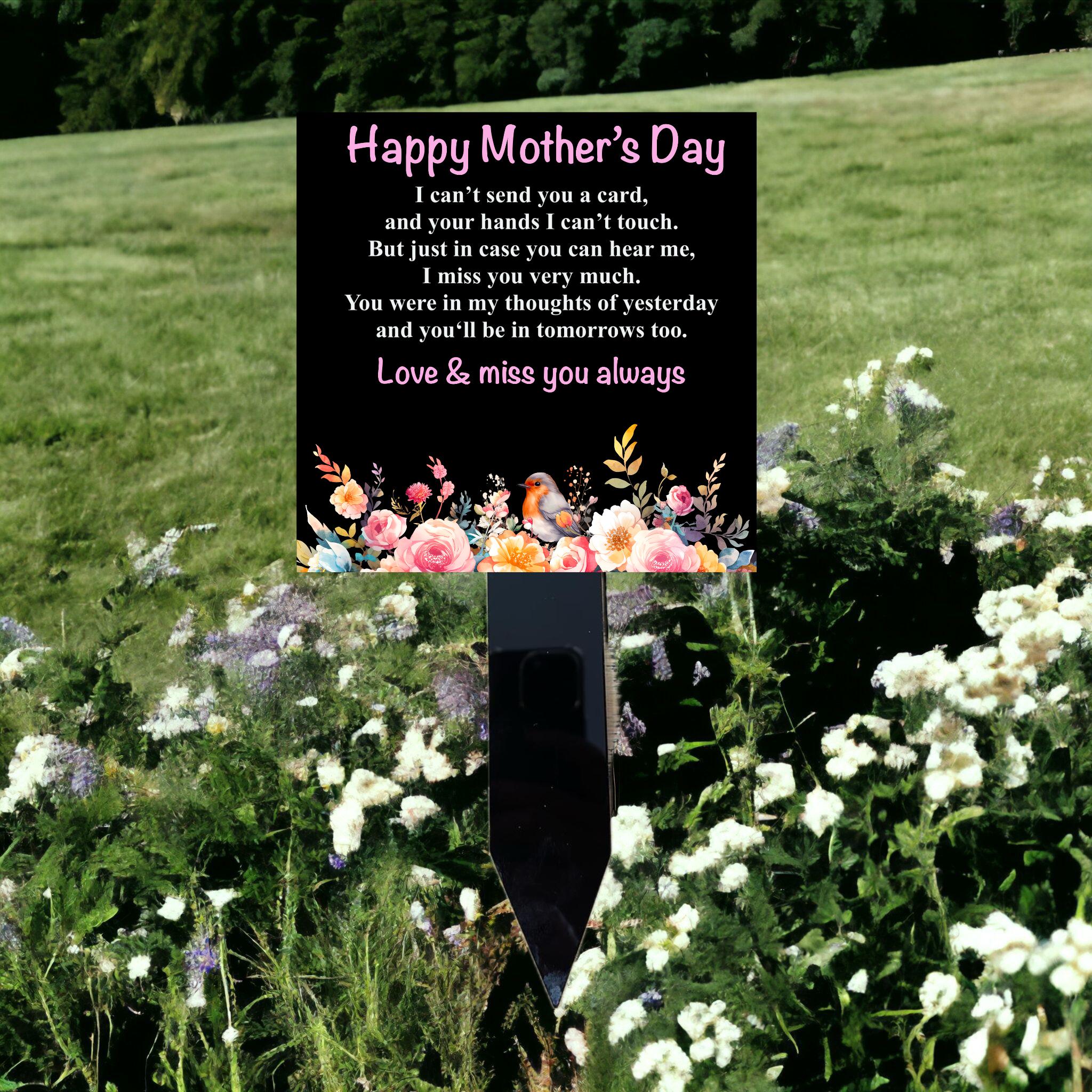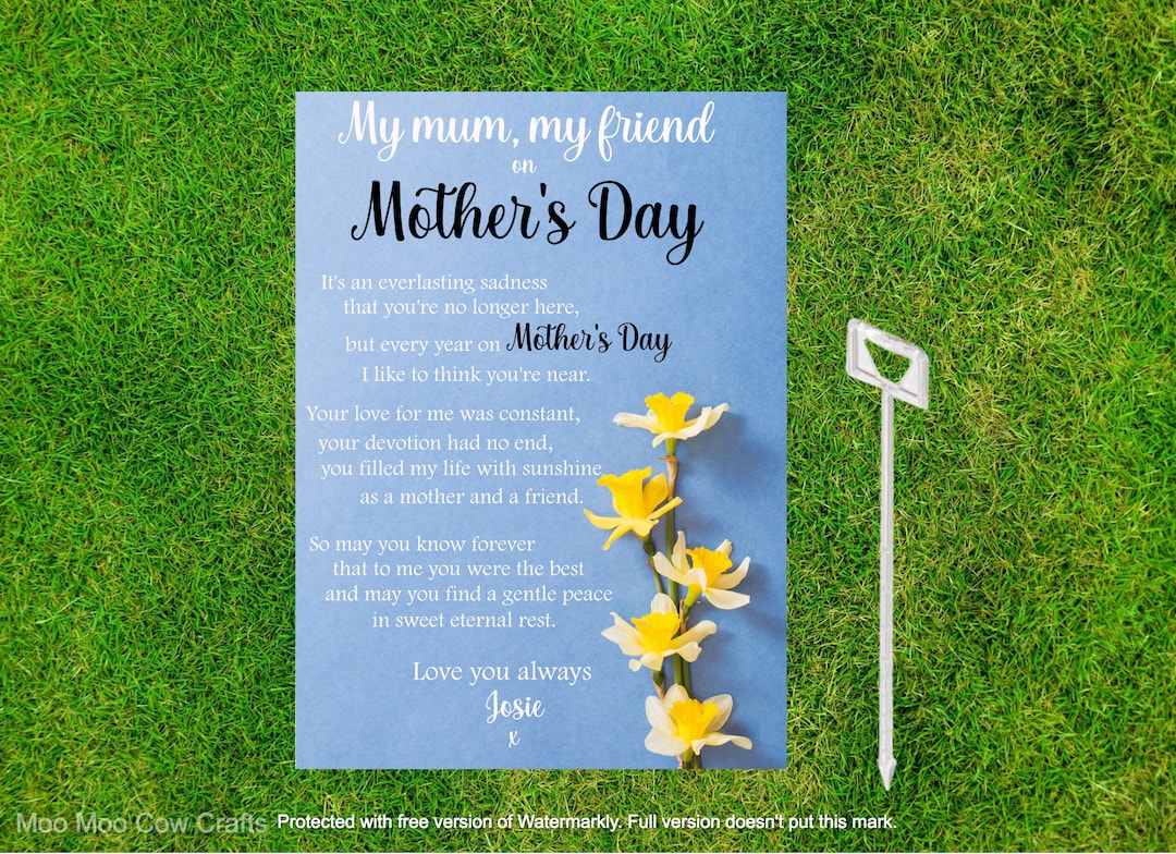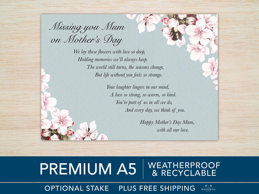 - It's a specially designed, often weatherproof, card placed at a graveside or memorial site on Mother's Day to express love and remembrance for a deceased mother. They typically contain verses and space for personal messages.