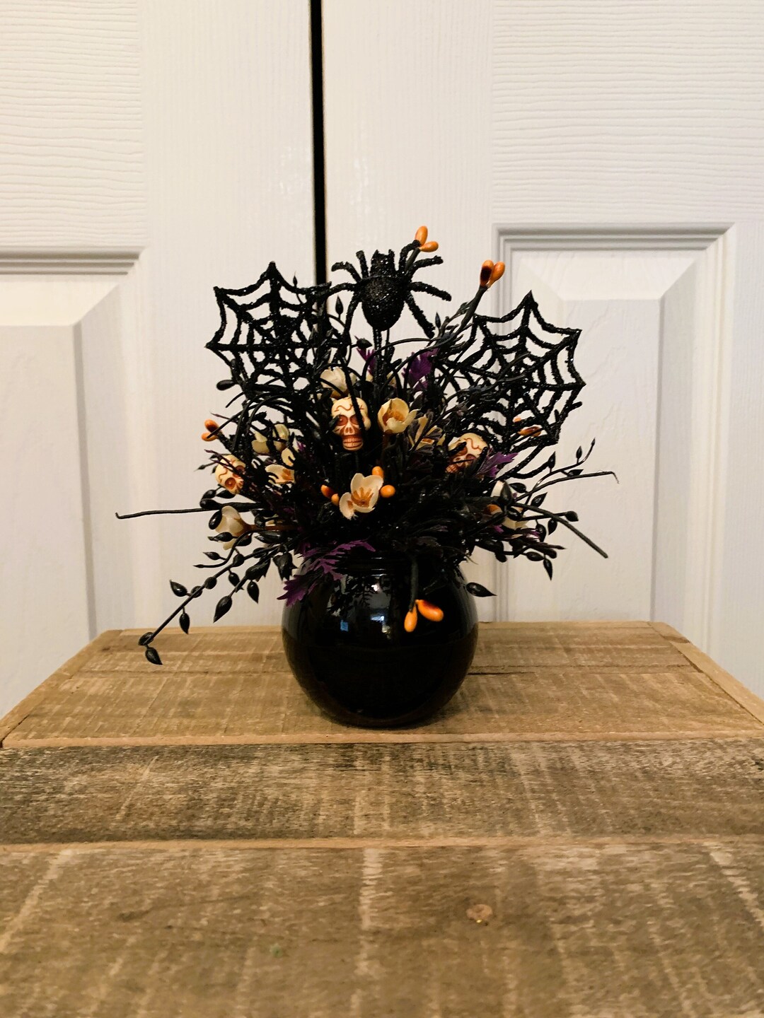 - Accents: Small decorative skulls, faux spiders or spiderwebs, velvet ribbons, feathers, dried moss, unique antique vases.