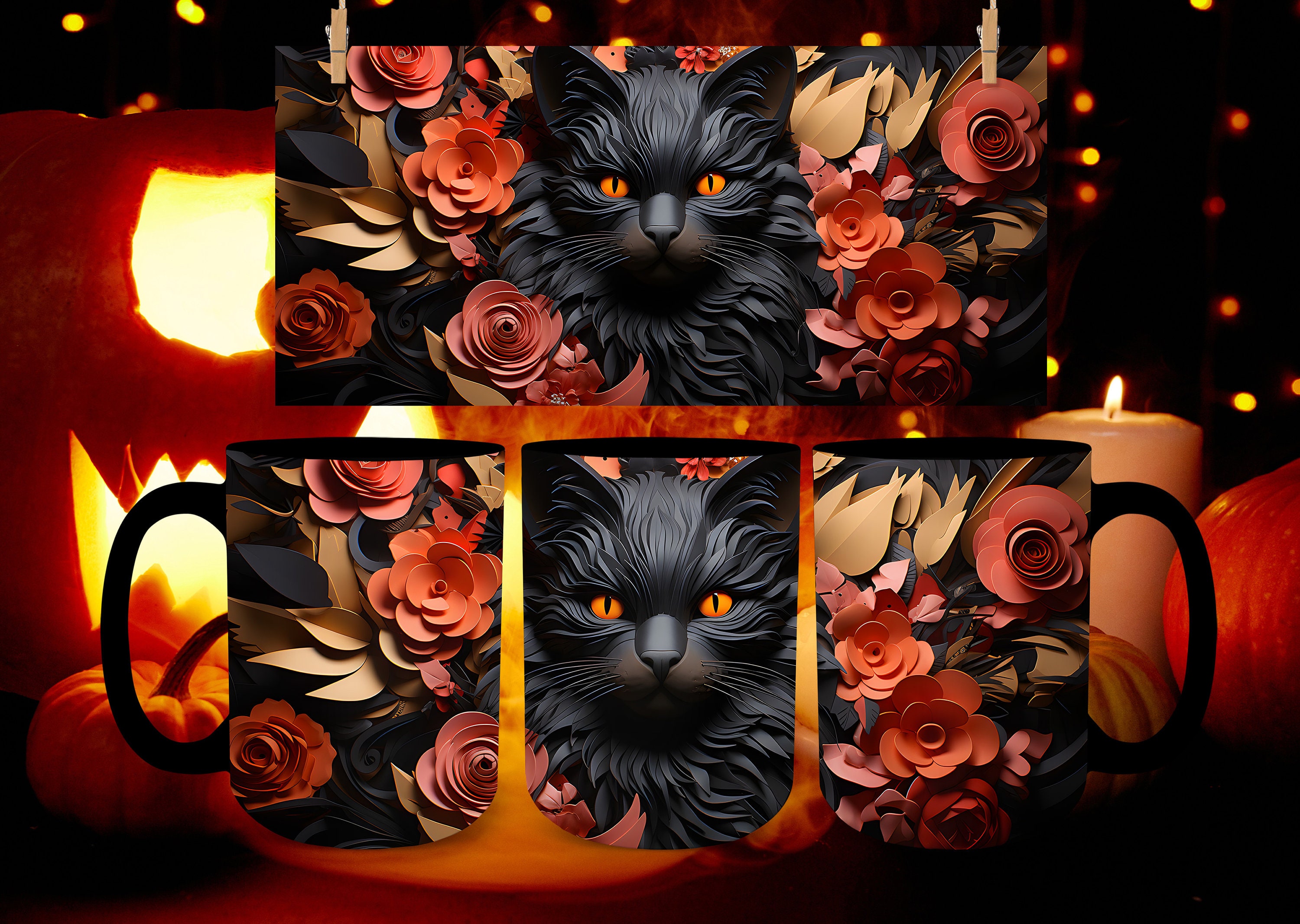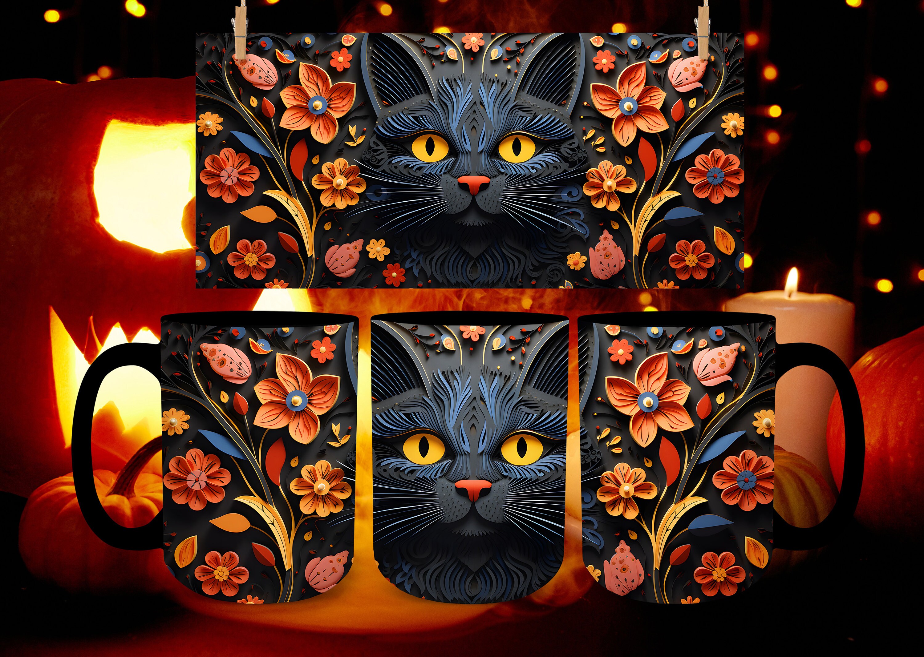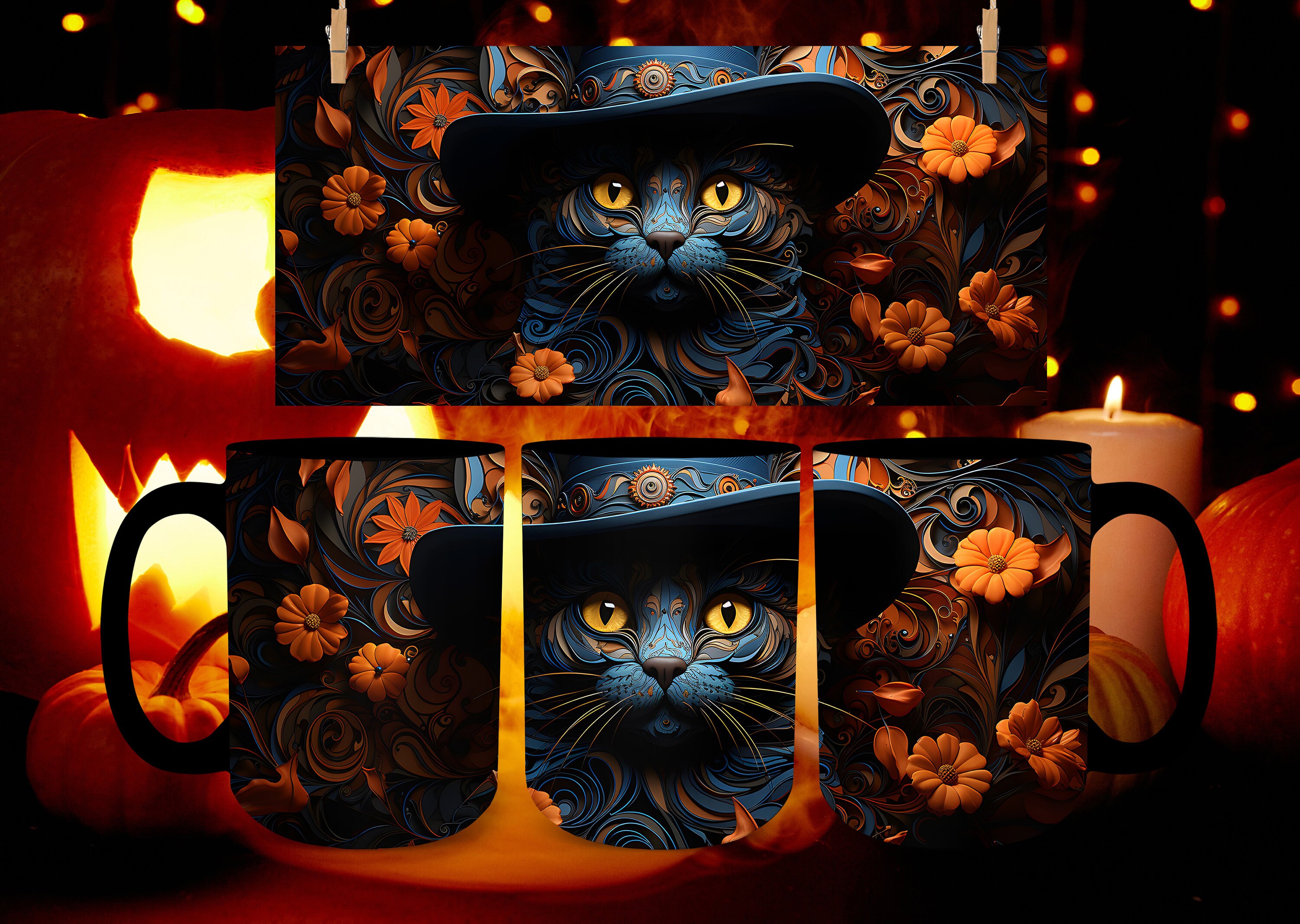 Discover an amazing halloween black cat mug background image, ideal for personalizing your devices with vibrant colors and intricate designs.