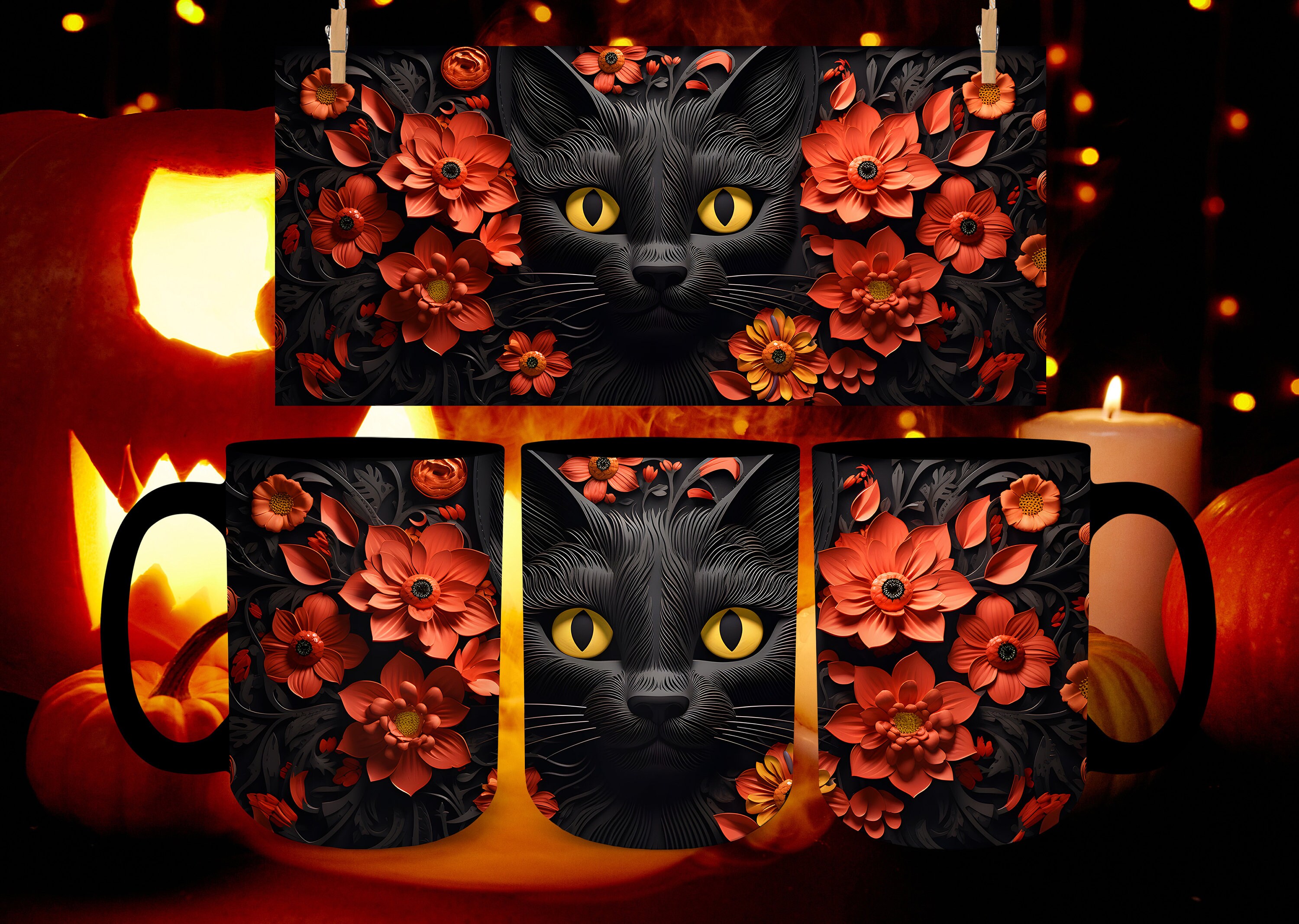 Transform your screen with this vivid halloween black cat mug artwork, a true masterpiece of digital design.